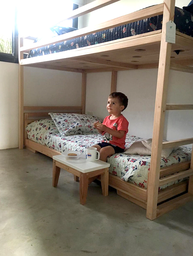 La cama superior se encuentra a solo 120 cm del piso, lo que permite acceso seguro y cercanía. La cama inferior está directamente sobre el piso, en línea con la pedagogía Montessori y el dia de mañana puede elevarse a altura tradicional. ES EVOLUTIVA.